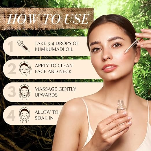 • Direction to use: Cleanse and dry the face. Take 2-3 drops of Kumkumadi Oil on palm. Gently spread it on your face evenly with an outward motion. Use daily before bedtime. Recommended for dry, normal, oily and sensitive skin types.