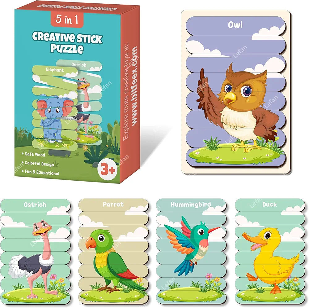 Lefan 5-in-1 Wooden Bird Stick Puzzle Animal Puzzle Sticks Set Kids Toys for 2-5 Years boy Montessori Early Learning Toy Gift 3 4 5 6 7 8 Years Kids