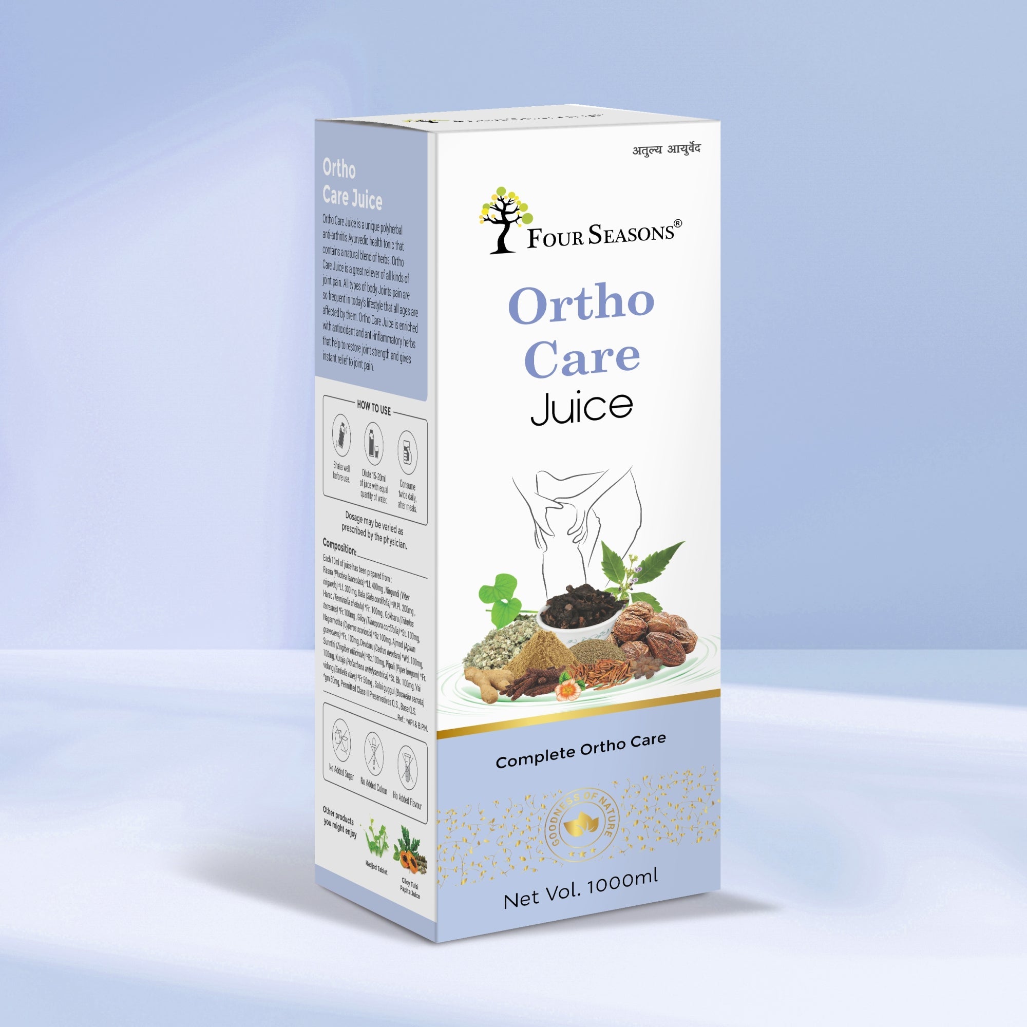 • Four Seasons Ortho Care Juice is a combination of carefully selected herbs intended to provide potential relief from joint pains and aches, contributing to the management of arthritis and other bone-related issues.