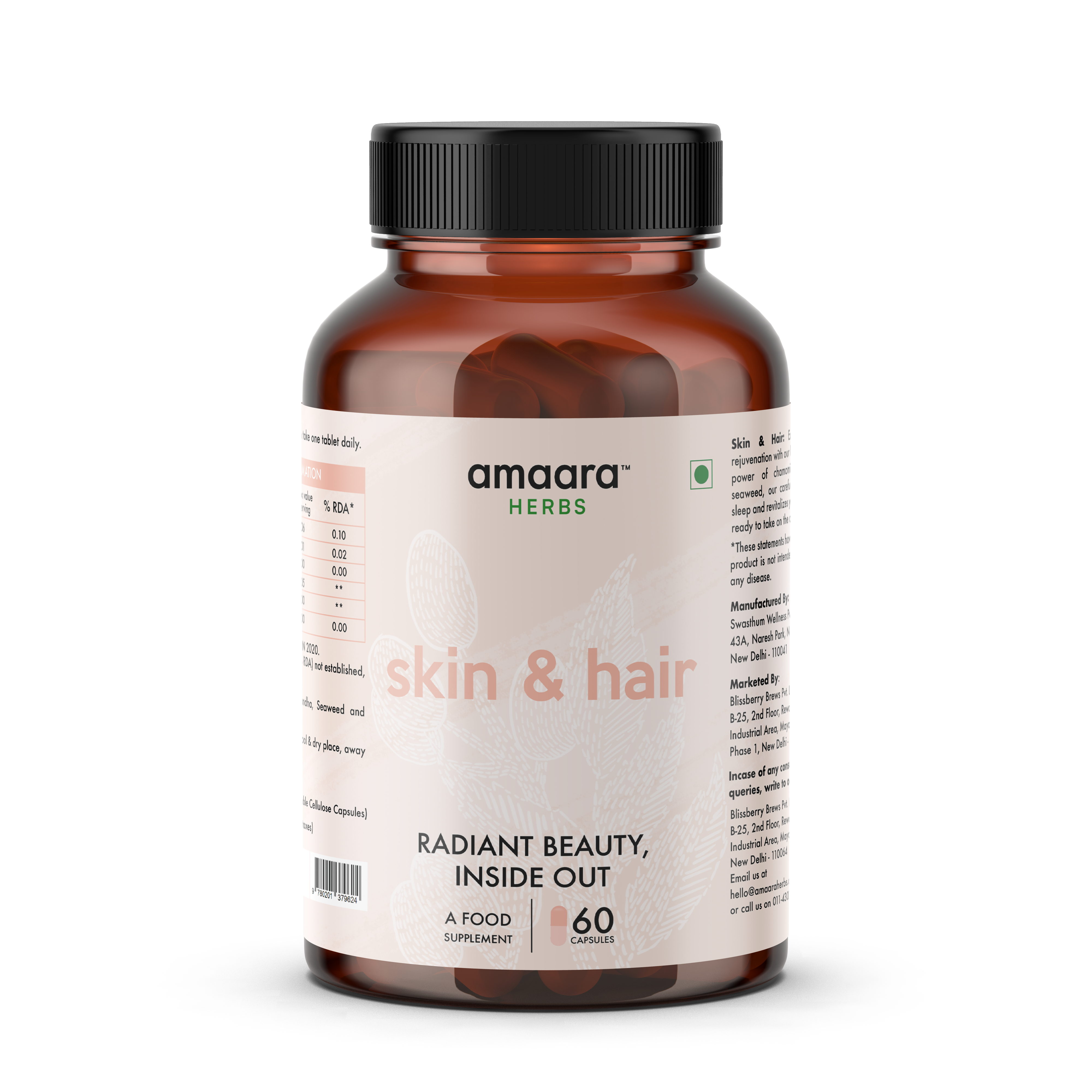 • Unwind and sleep peacefully with our Hair & Skin Capsules, a blissful blend of chamomile, ashwagandha, seaweed, and lavender for a restful night's sleep.