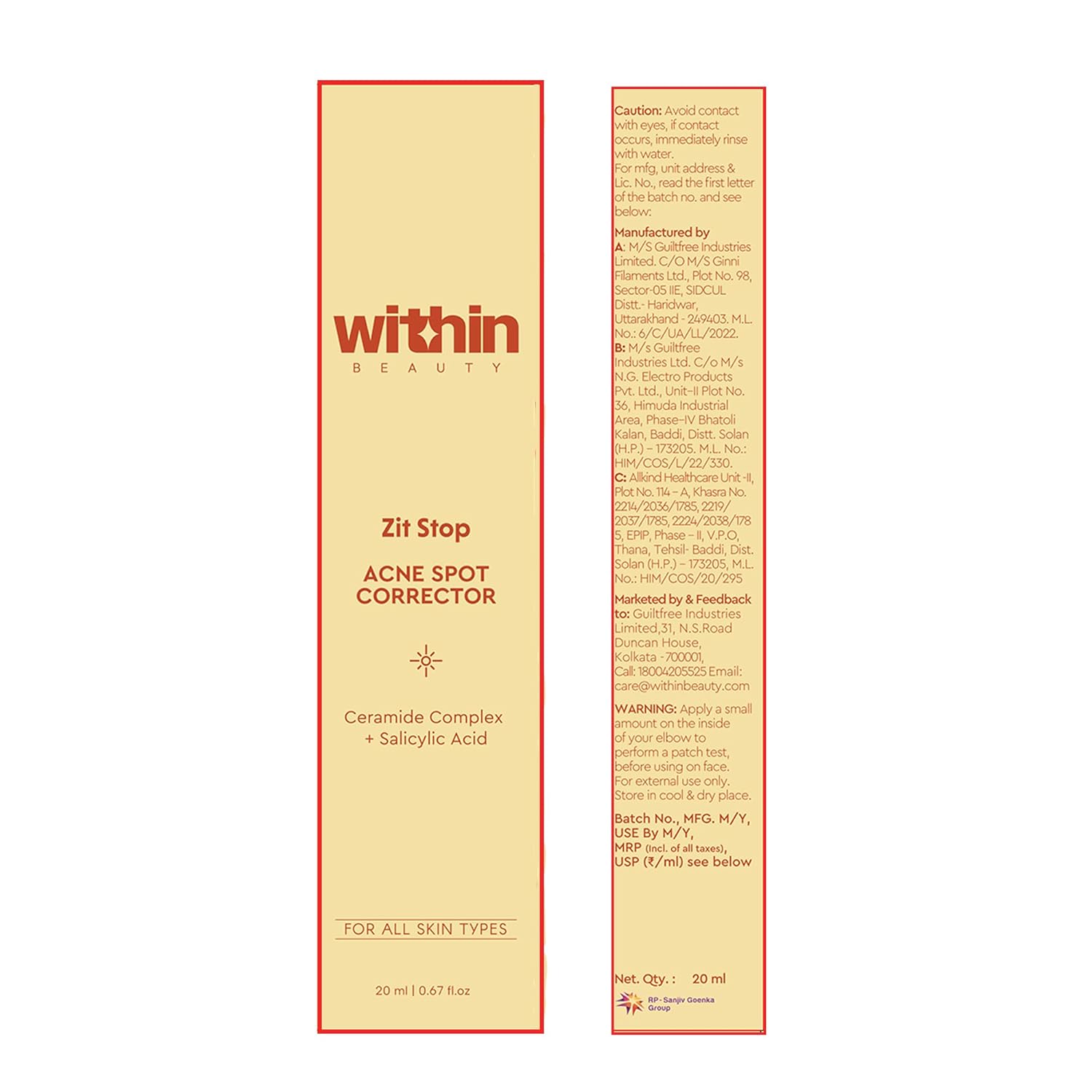- NO MORE ACNE: The Zit Stop acne spot corrector is a very unique formulation of salicylic acid & ceramide complex that not just fights active acne but also heals the skin barrier so that no new acnes appear.