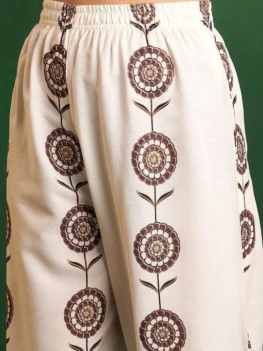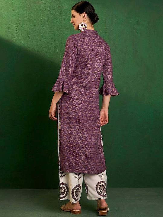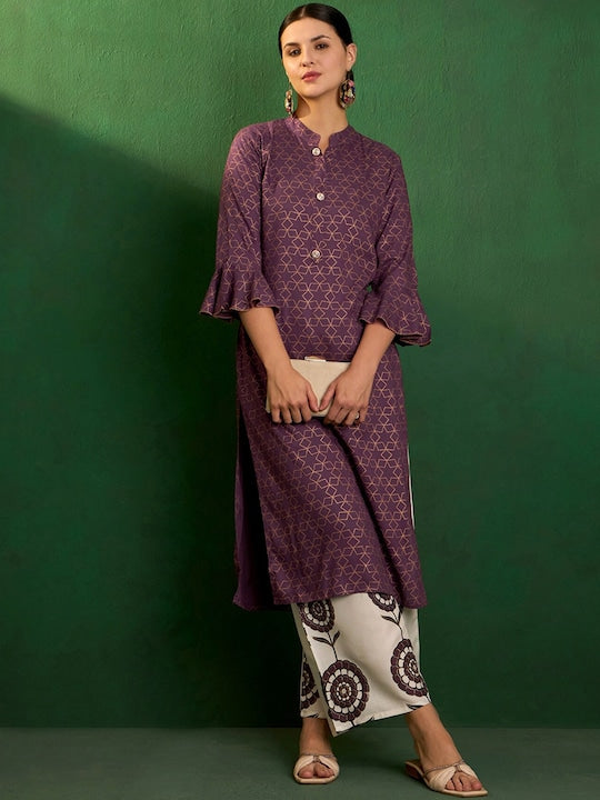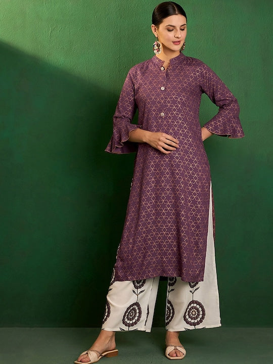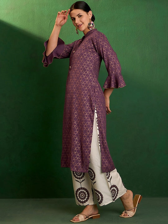 Sangria Geometric Printed Bell Sleeves Mandarin Collar Cotton Straight Kurta With Trousers