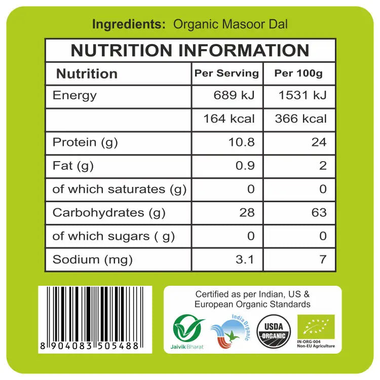 - 24 Mantra Organic Masoor Dal organic is unpolished, unadulterated, good source of macro and micronutrient proportion of Dietary Fiber.