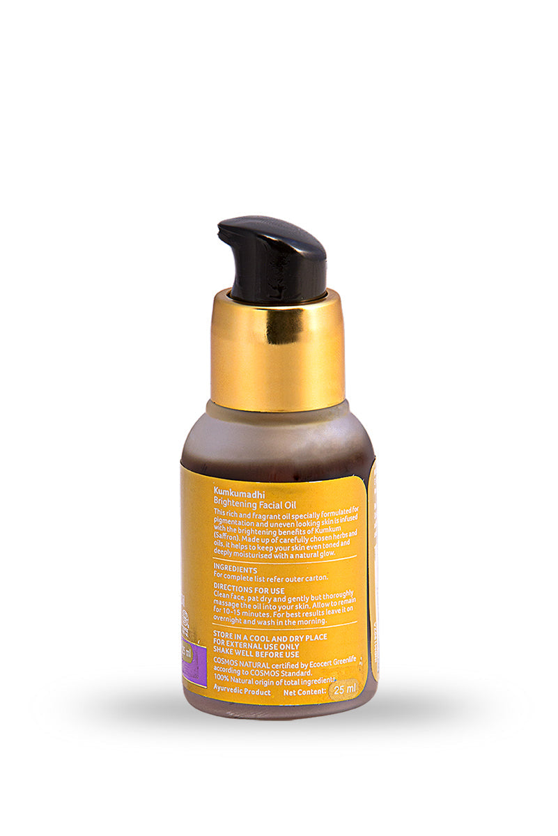 • ORGANIC INDIA Repair & Nourish KUMKUMADHI Brightening Facial Oil Infused with the brightening benefits of Kumkum (Saffron), this rich and fragrant oil has been formulated with carefully chosen herbs and oils for uneven pigmentation and blemished skin.