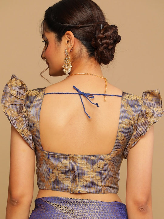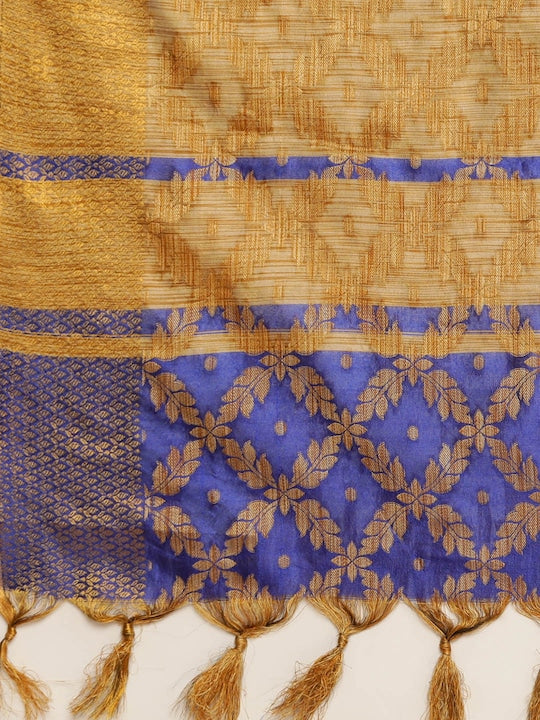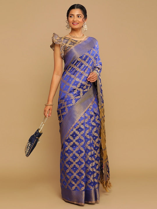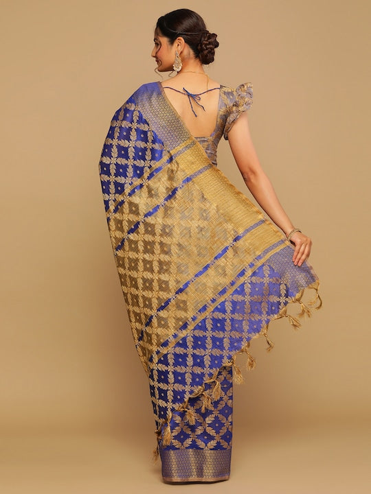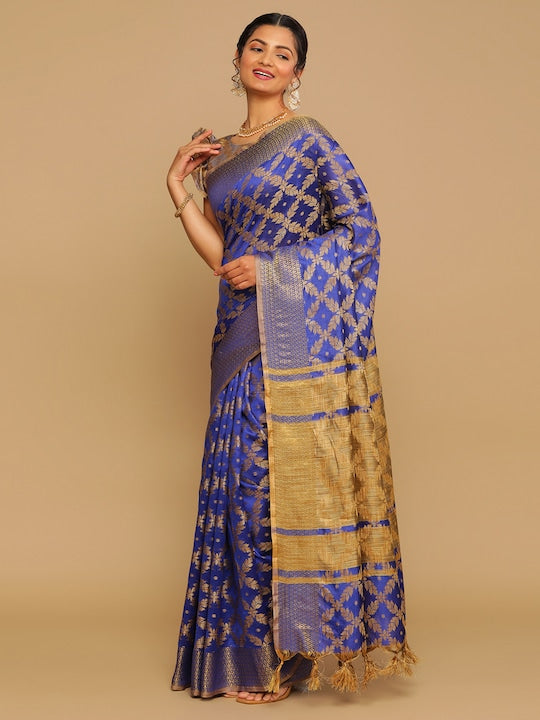 Satrani Blue & Gold-Toned Floral Zari Silk Cotton Banarasi Saree