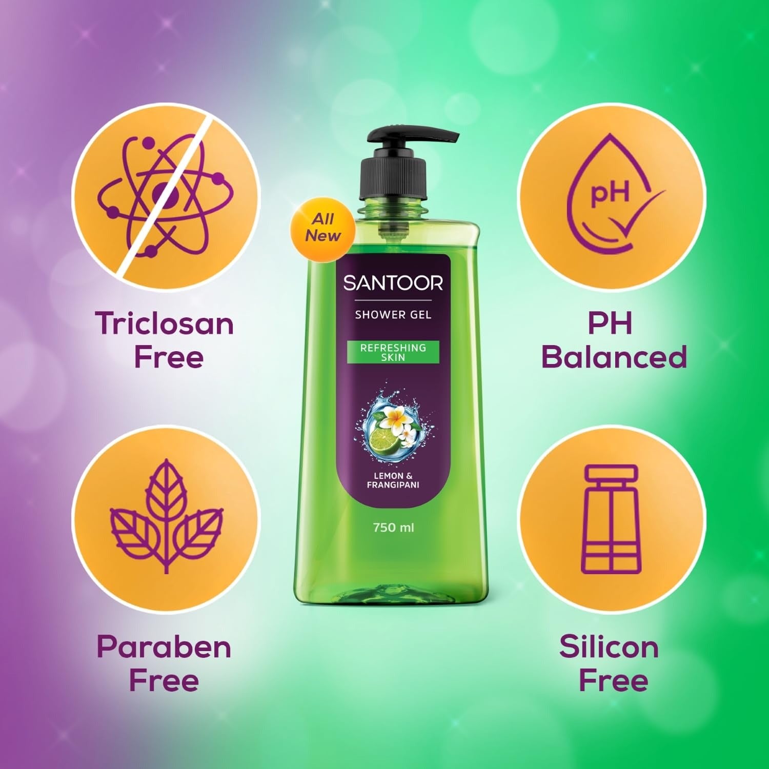 - Unravel Freshness: Dive into the revitalizing feel of Santoor Refreshing Shower Gel For Women, infused with lemon and frangipani extracts for an invigorating shower experience.