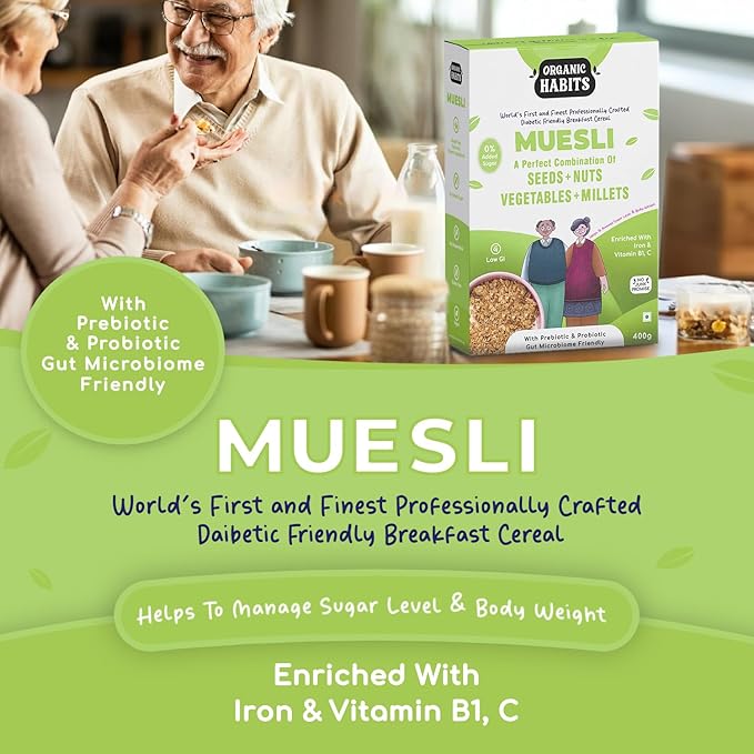 Organic Habits Muesli, Diabetic Friendly Breakfast Cereal With Fruit, Nuts, Seeds, Vegetables, Millets & Wholegrain - 400 Gms