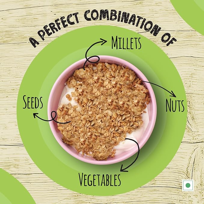 • Made for Your Well-being: Crafted with your wellness in mind, our muesli, enriched with dry fruits, flax seeds, and vegetables is low in glycemic index (GI) and boasts zero added sugar. It's an ideal snack option choice for those with sugar issues or anyone pursuing a sugar-free conscious diet.