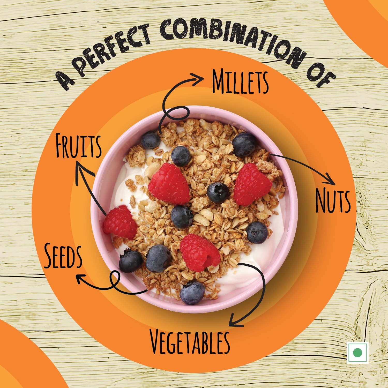 - ๐๐ข๐ ๐ก ๐๐ซ๐จ๐ญ๐๐ข๐ง Muesli: Nourishing protein oats, mixed nuts and seeds provide a satisfying crunch and a wholesome dose of proteins, keeping you full and energized, no matter how hectic your schedule.