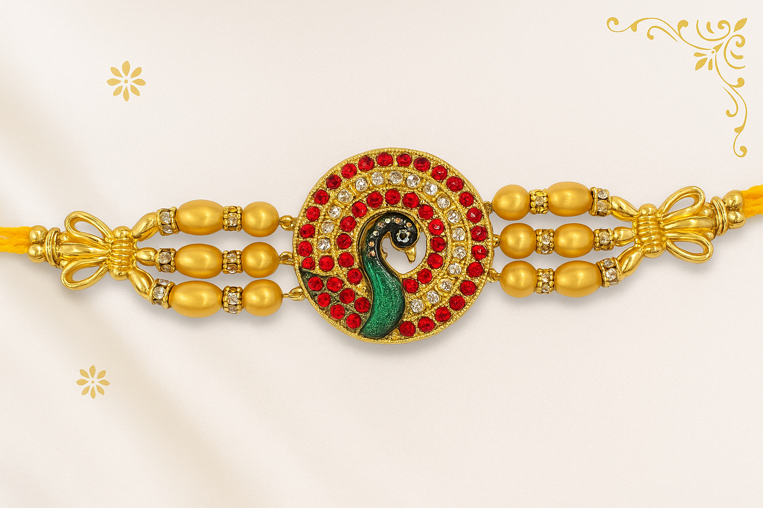 Elegant Peacock Design Rakhi with Golden Beads & Stone Work