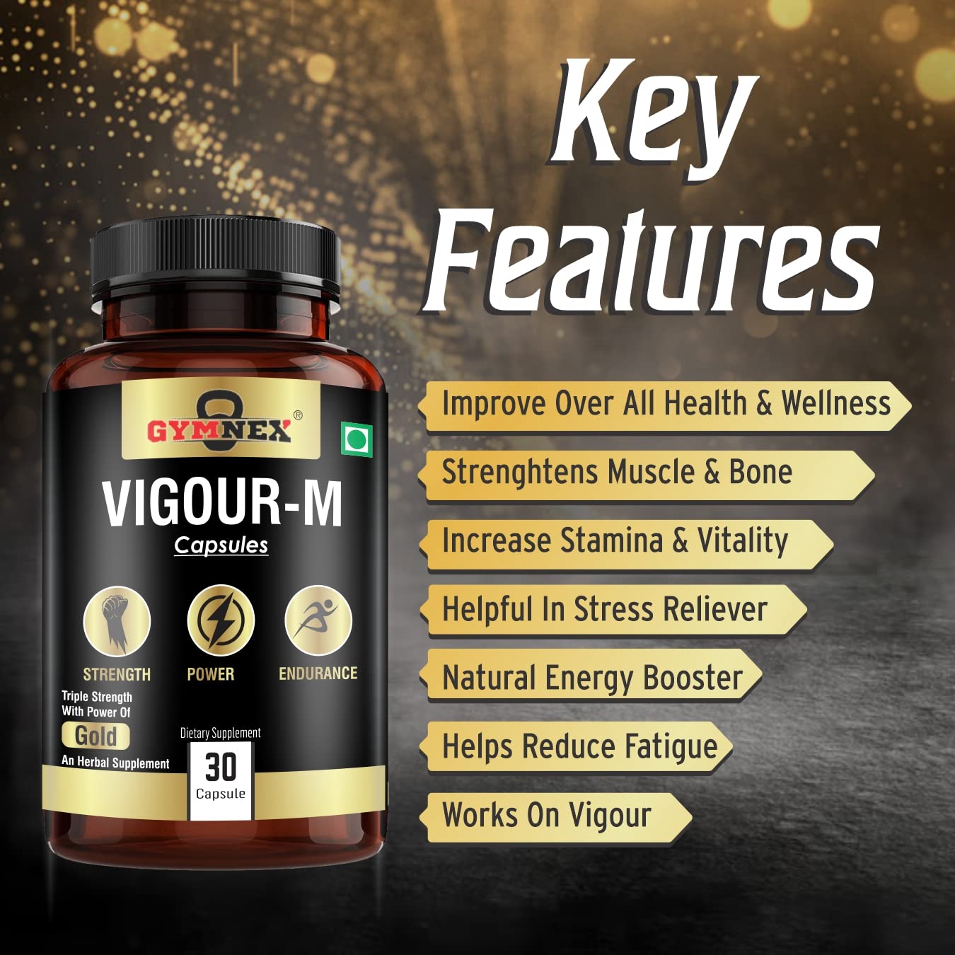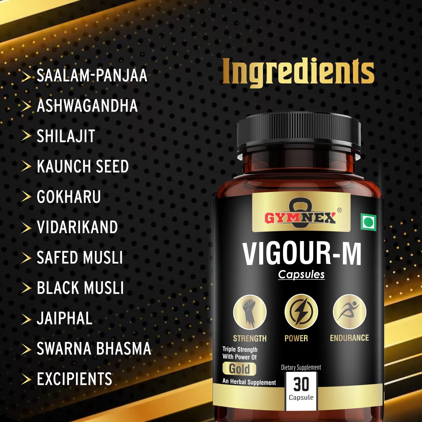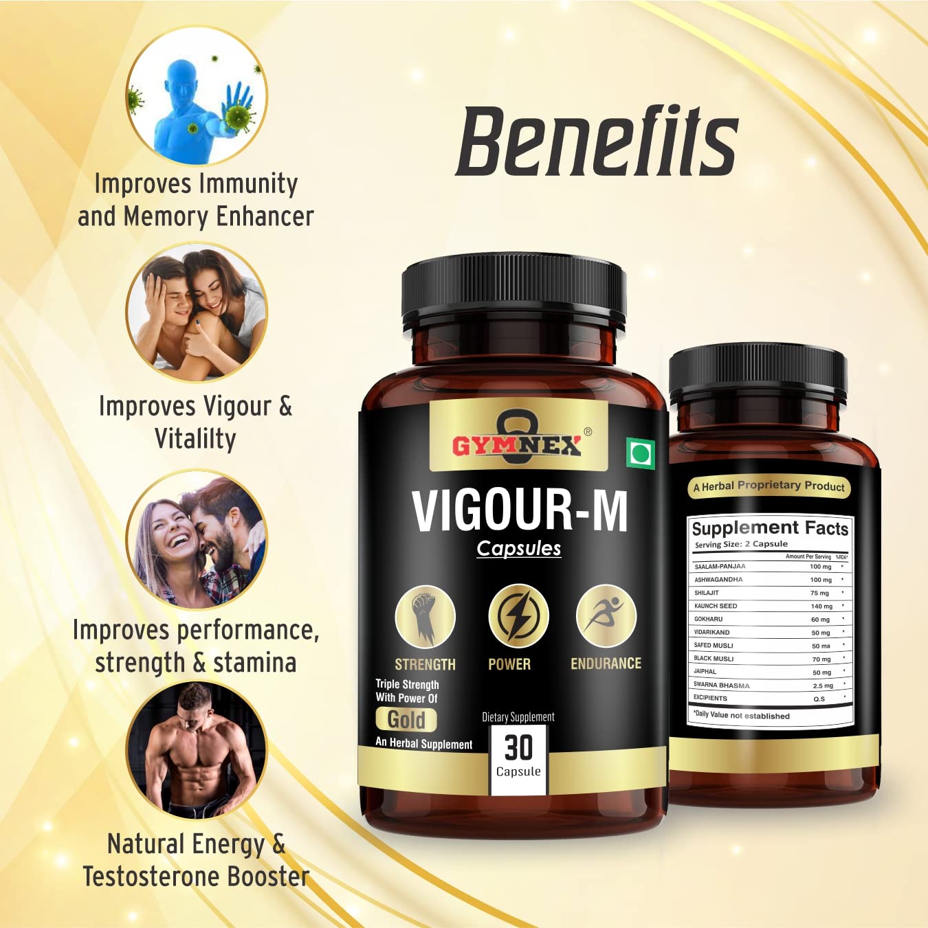 • PREMIUM, NATURAL INGREDIENTS : Our formula contains only the best natural ingredients, including Ashwagandha, Safed Musli, Gokshura Akarkara, Salam Panja, Black Musli, GOLD BHASMA. This optimum combination of the Natural ingredients, helps boost Confidence, Mood and Overall Well Being.