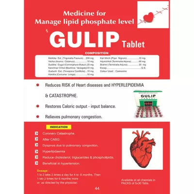 • Gulip Tablet is an ayurvedic tablet which effectively useful for reducing coronary catastrophe, after CABG, dyspnea due to pulmonary congestion, hyperlipidaemia, reduced cholesterol, triglycerides & phospholipids, and is beneficial in hypertension.