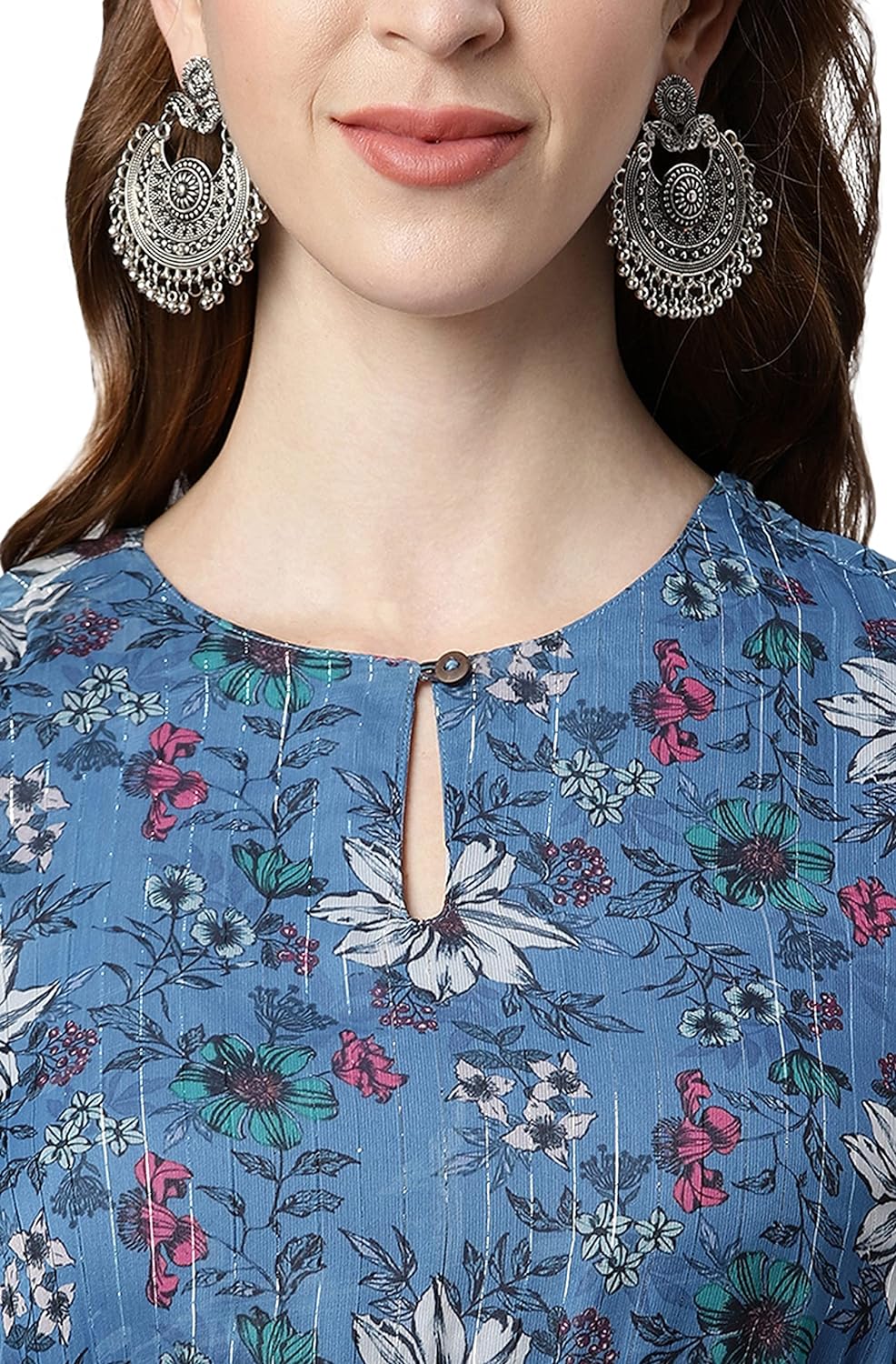Janasya Women's Blue Poly Georgette Floral Flared Western Dress