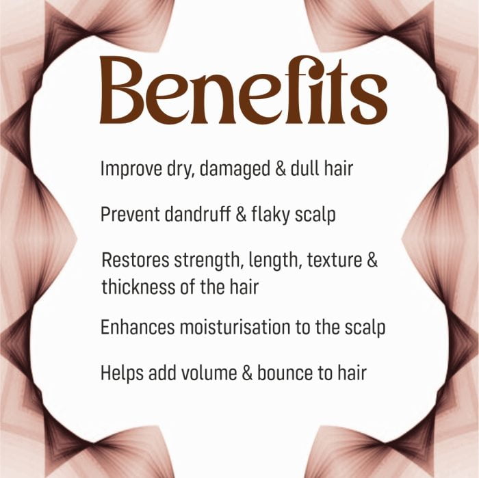 • Improve dry, damaged & dull hair Prevent dandruff & flaky scalp Enhances moisturisation to the scalp Restores strength, length, texture & thickness of the hair Helps add volume & bounce to hair