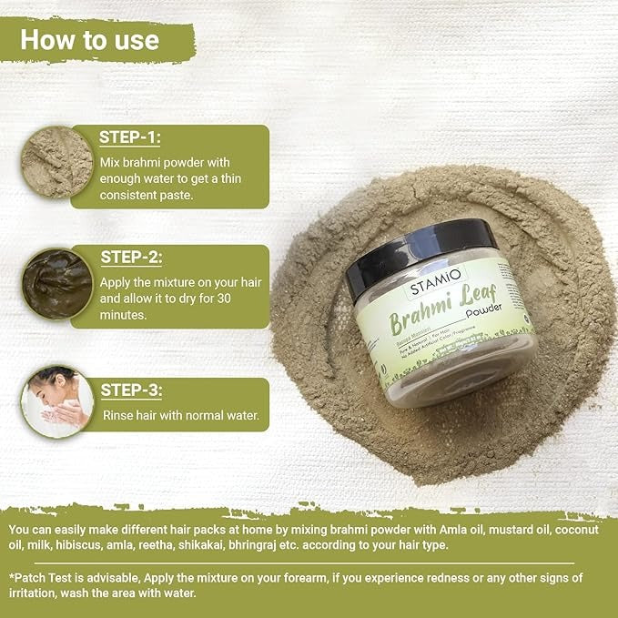 - You can easily make different hair packs at home by mixing brahmi powder with Amla oil, mustard oil, coconut oil, milk, hibiscus, amla, reetha, shikakai, bhringraj etc. according to your hair type. | *Patch Test is advisable, Apply the mixture on your forearm, if you experience redness or any other signs of irritation, wash the area with water.