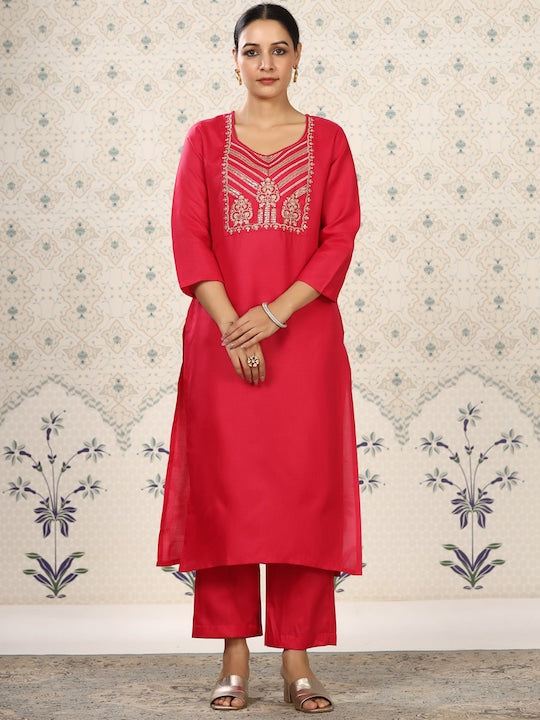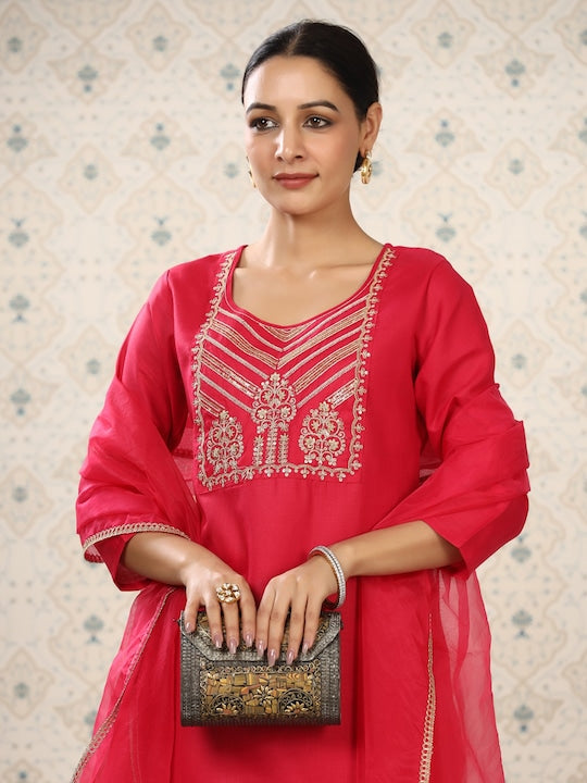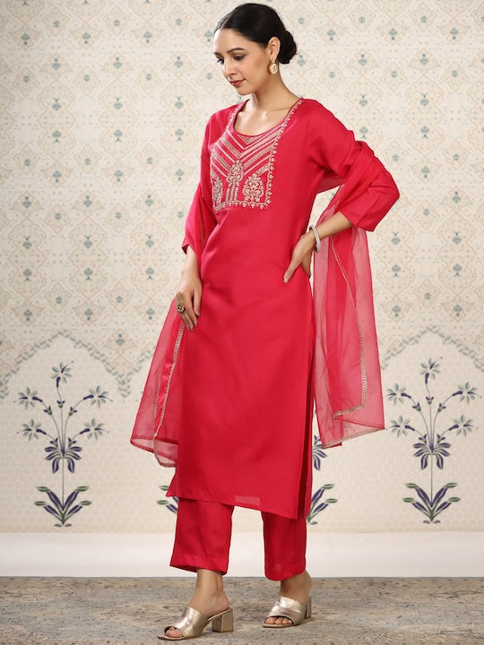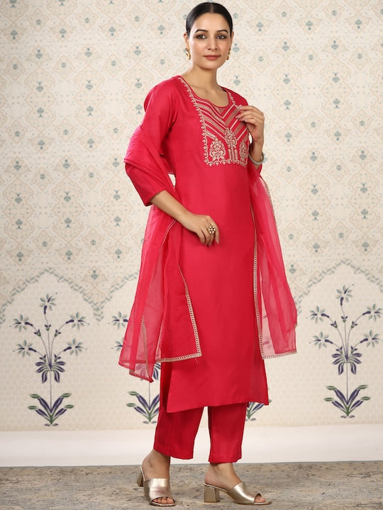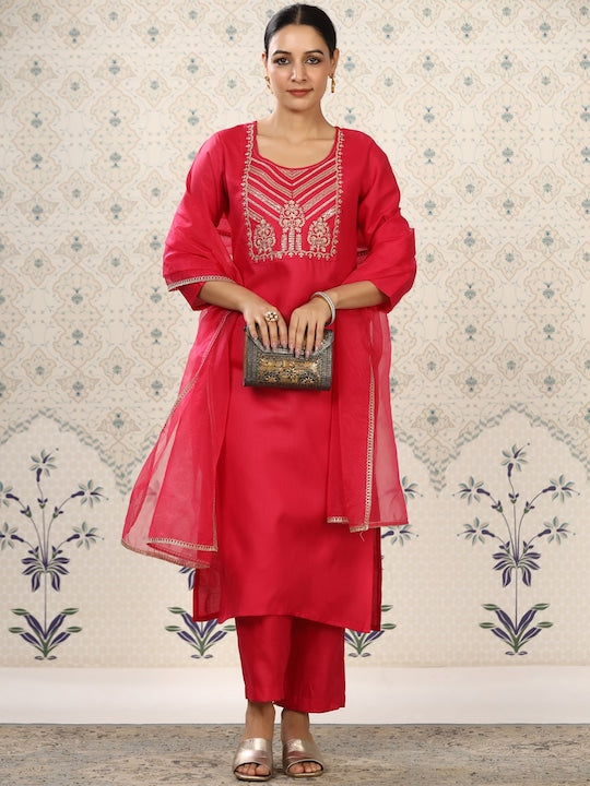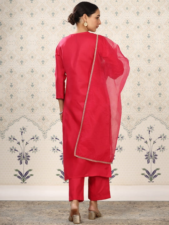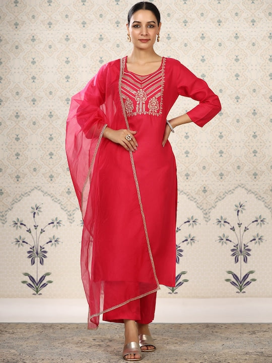 - Pink & gold-toned embroidered Kurta with Trousers and Dupatta