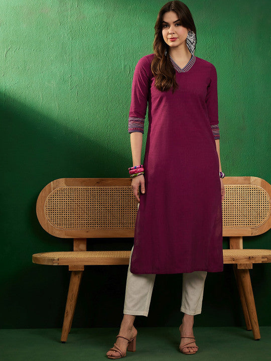 Sangria Burgundy V-Neck Thread Work Pure Cotton Straight Kurta