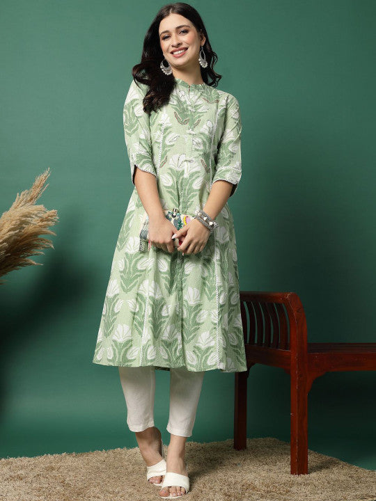 Sangria Floral Printed Pure Cotton Mandarin Collar Thread Work A-Line Kurta