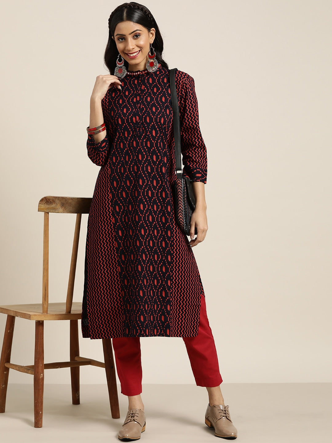 Sangria Women Navy Blue & Rust Red Pure Cotton Abstract Printed Mirror Work Detail Kurta