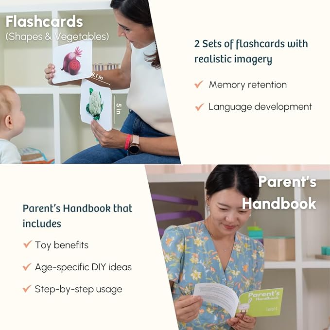 • Ultimate Play Set: The Curious Cub montessori baby toys for 7+ months kids features 8 carefully chosen newborn baby toys, including an object permanence box, sensory mat, single piece puzzle, napkin pull box, 'Parts of Me' book, shapes and vegetables flashcards, and a parents handbook