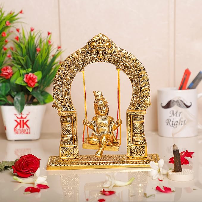 • Product Details:- Lord Krishna Swing Jhula , Material:- Aluminium , Colour:- Gold ,Dimensions (L X B X H):- 19.5 X 6.5 X 22.5 CM , Weight:-590 GR
