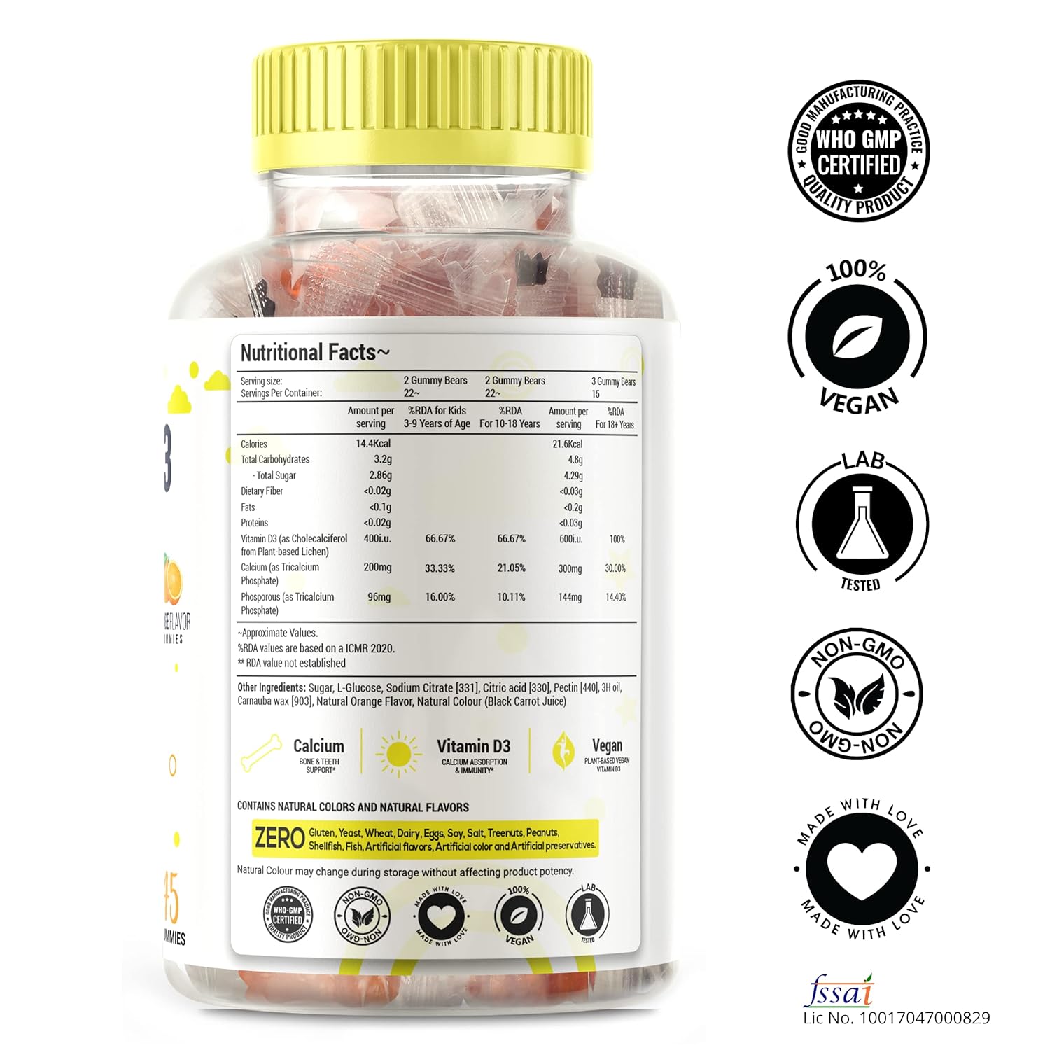 - Vegan & Plant Based: Unlike most Vitamin D supplements that contains animal derived or synthetic Vitamin D3, our gummies contain Vitamin D3(cholecalciferol) that is naturally sourced from Plants(lichen).