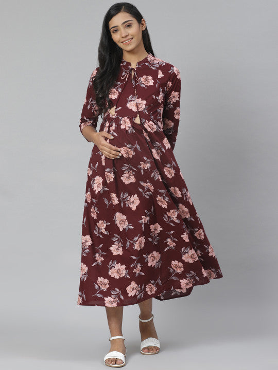 Anayna Women Burgundy & Pink Floral Printed Pure Cotton Maternity A-Line Dress