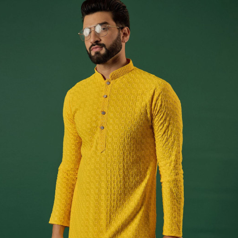 • This yellow kurta pajama looks absolutely stunning! The bright color gives a fresh and festive vibe, perfect for traditional functions or special occasions.