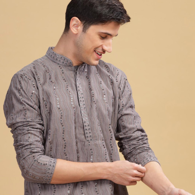 Anouk Grey Ethnic Embroidered Mandarin Collar Sequinned Lucknowi Cotton Straight Kurta