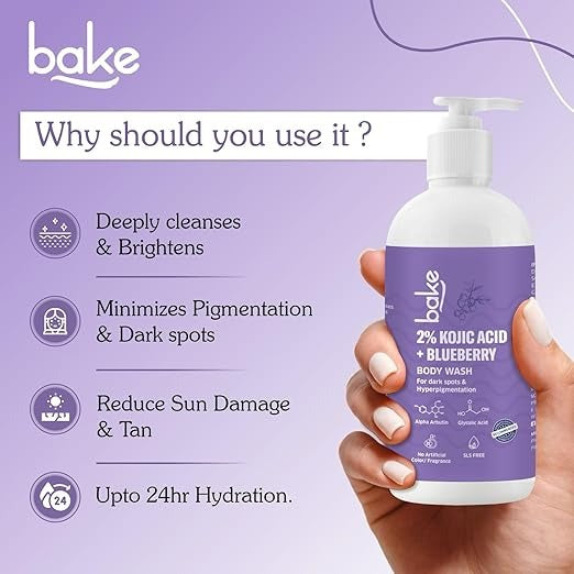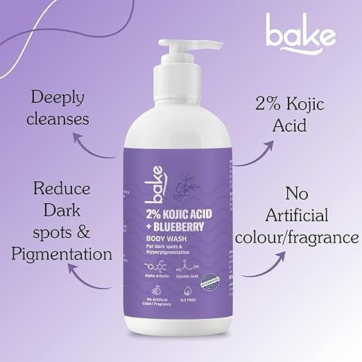 - SKIN BRIGHTENING POWERHOUSE : BAKE 2% Kojic Acid Body Wash is carefully formulated to inhibit melanin production, promoting a visibly brighter and more even complexion. By promoting a reduction in dark spots and an even skin tone, Kojic Acid contributes to a brighter and more radiant complexion. This can result in a healthier and more youthful appearance.