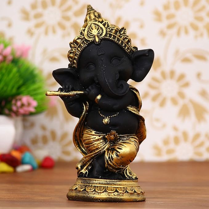 - The Golden and Black Lord Ganesha Idol Playing Flute is a durable and long-lasting item that is ready to use and ideal for enhancing the ambiance of your kitchen, living room, or home temple. This Ganesha statue is not only a beautiful decorative item, but it is also perfect for car dashboard decor, making it a versatile item that can be used in a variety of settings.