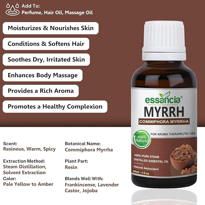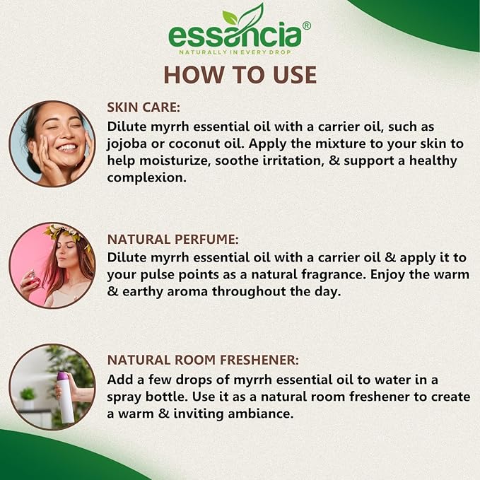 • Natural Perfume: Dilute myrrh essential oil with a carrier oil & apply it to your pulse points as a natural fragrance. Enjoy the warm & earthy aroma throughout the day.