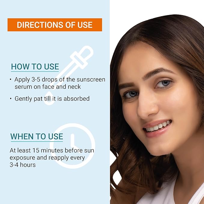 - How to Apply: Apply 3-5 drops of the serum sunscreen on your face and neck. Gently pat it till it’s absorbed. Re-apply after every 6 hours. Use the serum sunscreen as the last step in your skincare regimen.