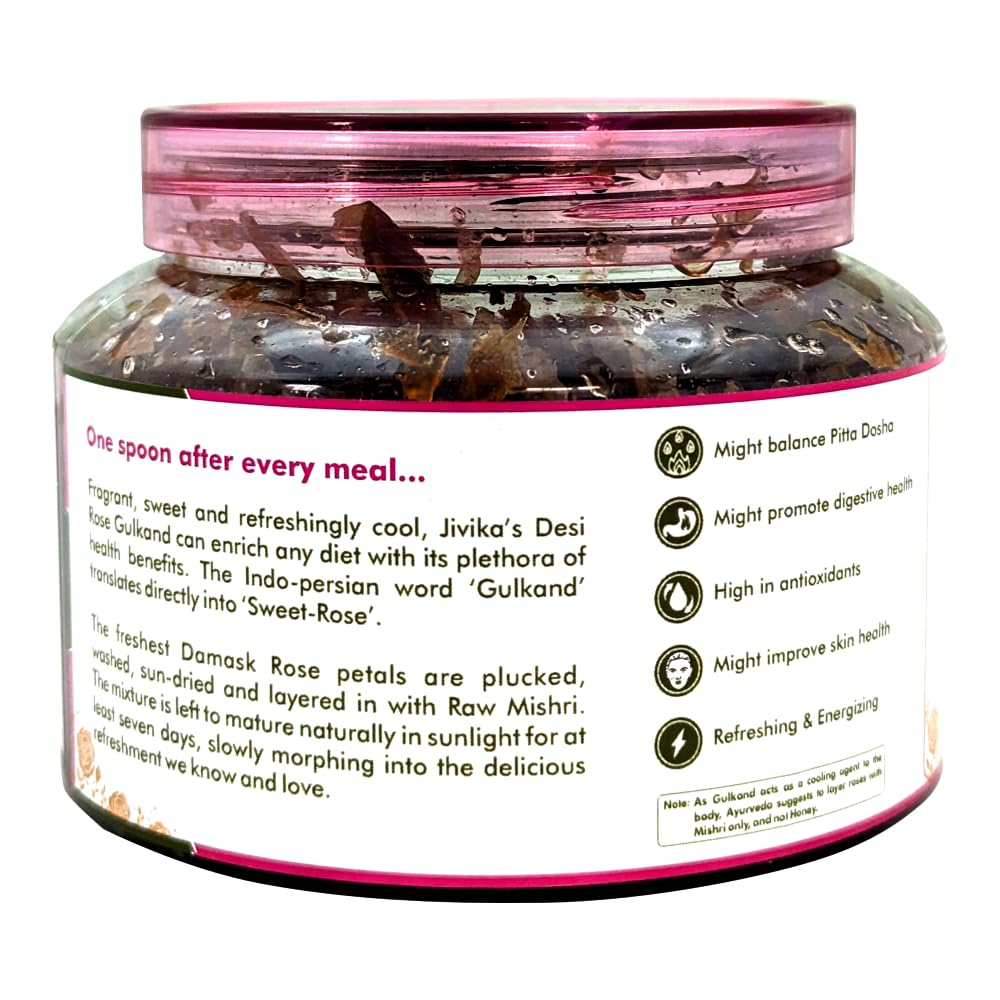 • HAND CRAFTED Nutritious Damask Rose Petals are carefully plucked and layered with Mishri. The mixture is then left to naturally mature in sunlight for 7 days.