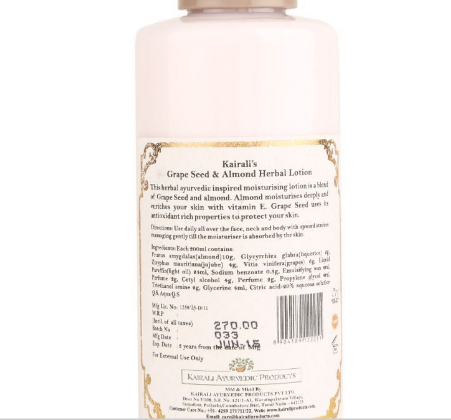 - Kairali's Grape Seed & Almond Herbal Moisturizing Lotion with antioxidants and vitamins