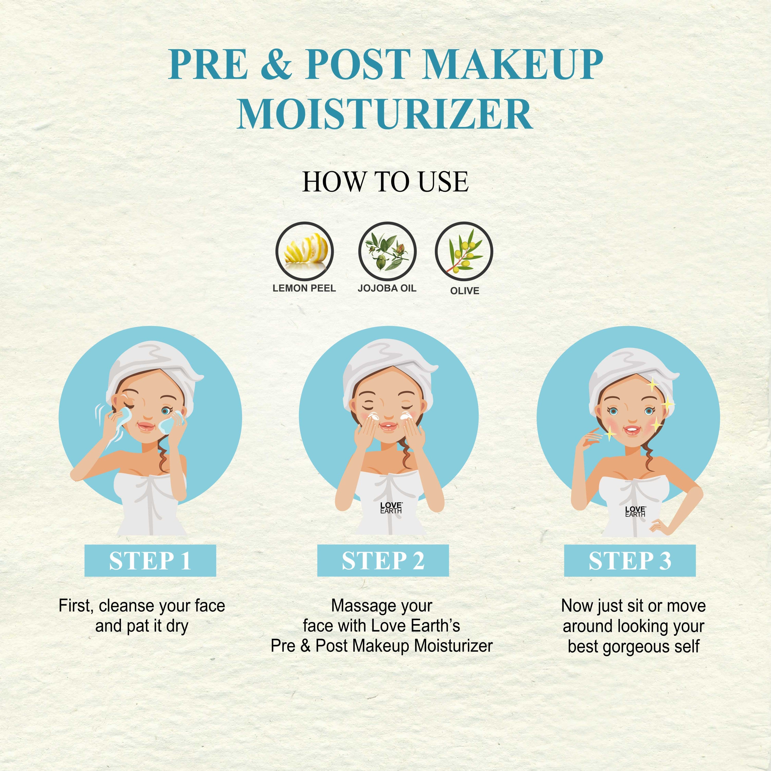 - Love Earth Pre & Post Makeup Moisturizer is here to take care of that gorgeous skin of yours. It is free from any harmful chemicals and hence, safe to use.