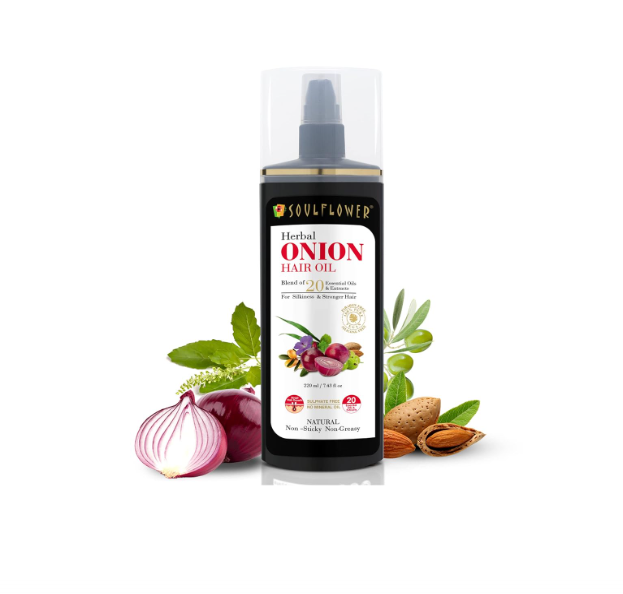 • HESoulflower hair growth onion hair oil is enriched with keratin-rich sulphur and a blend of 20 essential oils that controls hair fall & dandruff & helps in hair growth.