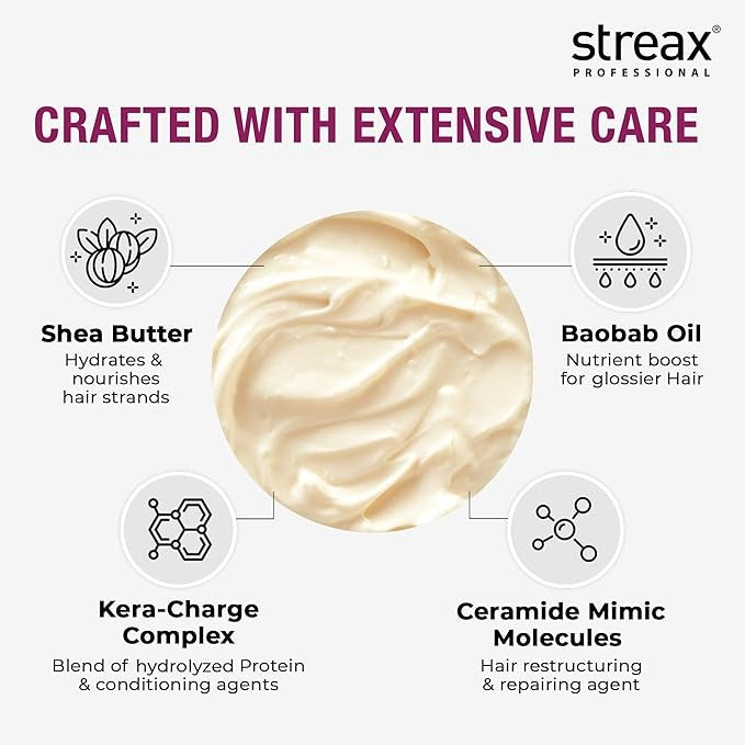 • Advanced Formula: The conditioner for straightened hair ispowered by the expert-crafted Kera Charge complex, a unique blend of hydrolysed proteins and conditioning agents that help in the retention of tensile strength and smoothness of straightening. Fused with Baobab oil and ceramide mimiv molecules, the conditoner locks moisture in your locks to give you smooth, long-lasting, straightened hair."