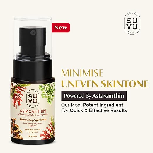 • Radiance-Boosting Night Serum: SUYU Astaxanthin Face Serum is crafted transparently and combines the power of astaxanthin—6000x stronger than Vitamin C—with Chaga and Shiitake mushrooms, Ashwagandha, Rosehip, and Moringa oils. This potent blend astaxanthin serum helps repair skin, fade dark spots, improve elasticity, and rejuvenate your complexion for a youthful glow over a period of time.