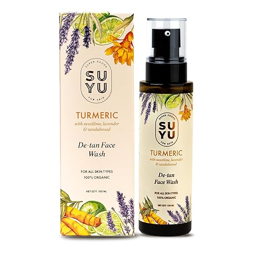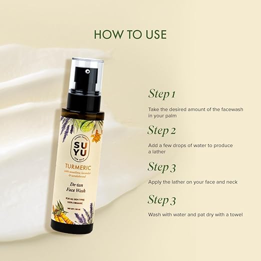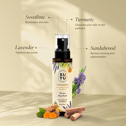 - Illuminating Cleanser: SUYU Turmeric De-Tan Glow Face Wash, enriched with Turmeric and Sandalwood, gently cleanses and repairs sun damage, leaving you with a visibly brighter skin tone and a refreshed surface. Ideal as a face wash for both men and women.
