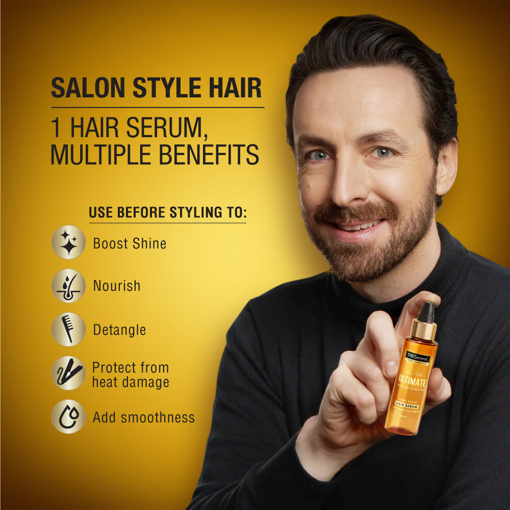- Gloss Ultimate Ultra Shine Hair Serum Salon style hair, with super shiny finish Salon Quality TRESemme Gloss Ultimate Hair Serum is infused with Vitamin E and a blend of 3 powerful oils nourishing Coconut oil, conditioning Macadamia Oil and moisturizing Sunflower Seed Oil provides glossy shine and deep nourishment to hair.