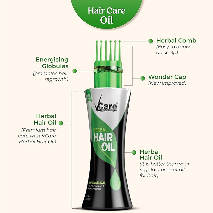 • Holistic Hair Care Herbal Hair Oil :Elevate your hair care routine with VCare's New Improved Herbal Hair Oil. This premium hair oil boasts a unique blend of 15 natural and herbal oils, including coconut, ylang ylang, olive, rosemary, hibiscus, and amla, offering a comprehensive solution for your hair care needs.