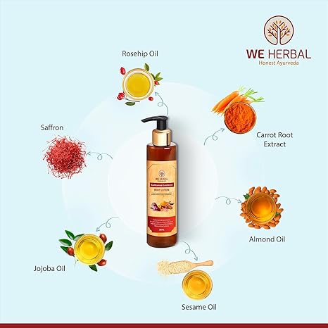 • Safe and Natural Ingredients: Free from harsh chemicals, our body lotion uses a blend of natural ingredients like Kumkumadi oil, Rosehip oil, Carrot root extract, Almond oil, Jojoba oil, Sesame oil, and other Ayurvedic herbs. This ensures a gentle yet effective skincare experience suitable for all skin types.