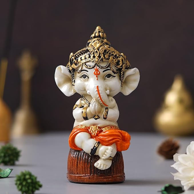 Ecraftindia Orange Polyresin Handcrafted Lord Ganesha Idol Sitting on Rock | God Idol