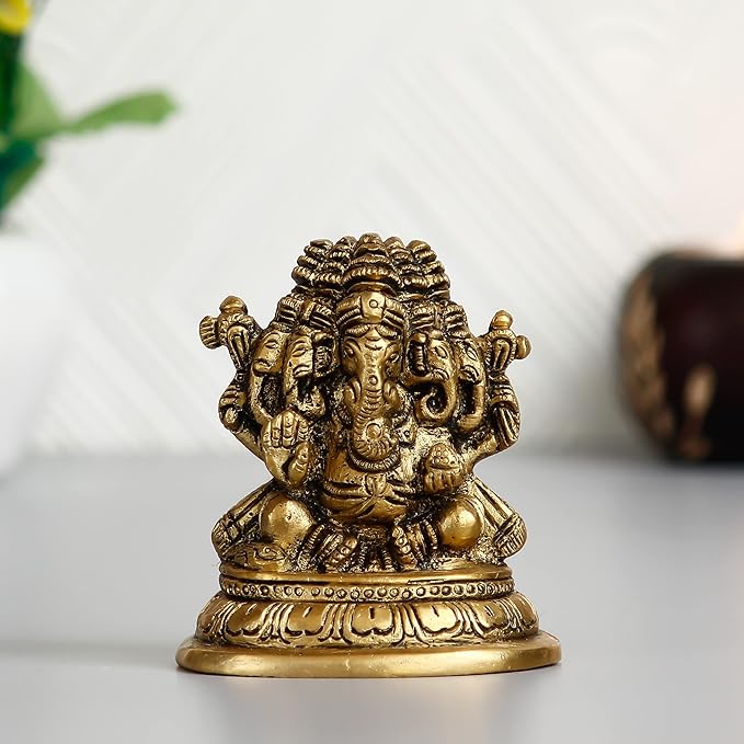 Ecraftindia Handcrafted Golden Brass Panchmukhi Lord Ganesha Idol | Hindu God Idol | Home Decor | Puja Room