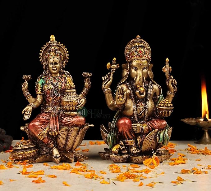 Indicast 7" Inch Cold Cast Resin Laxmi Showpiece for Puja Room and Temple Antique Decor | Metal Finish, Copper
