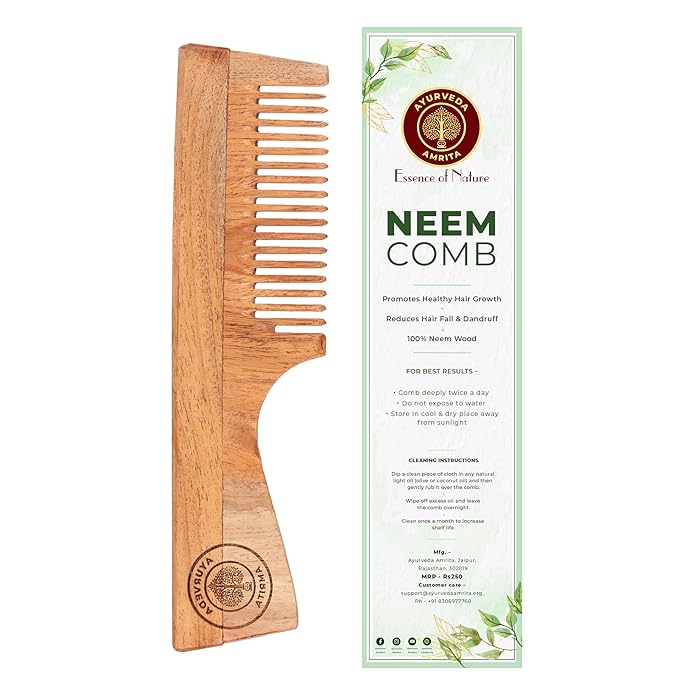 Ayurveda Amrita Organic Twin Tooth & Handle Neem Wood Comb | Helps in Dandruff Removal