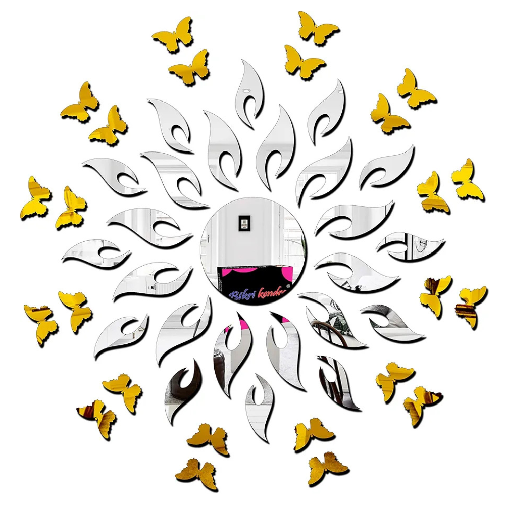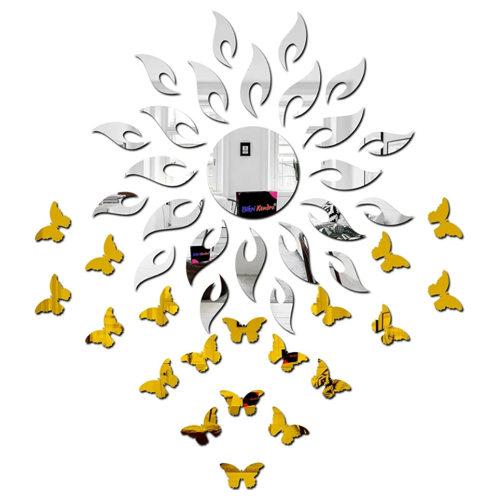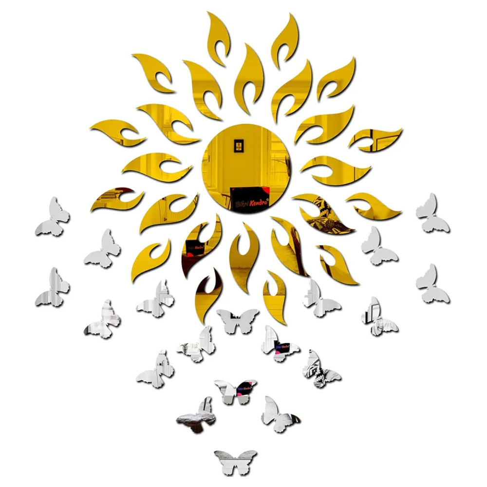 Bikri Kendra 3D Acrylic Mirror Golden Sun with Silver Butterfly Wall Stickers