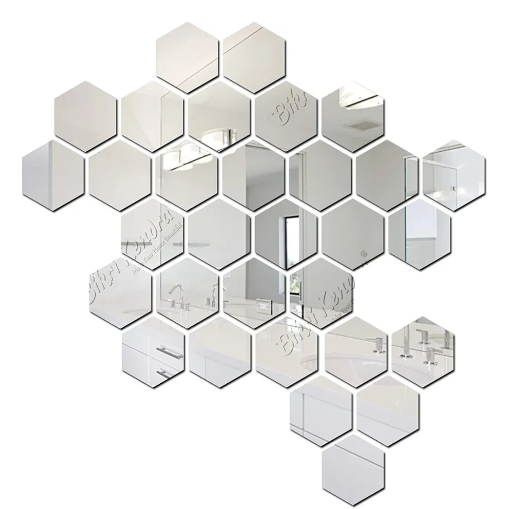 Bikri Kendra 32 Hexagon with 20 Butterfly Silver Mirror Stickers for Wall Hexagon Mirror Wall Stickers