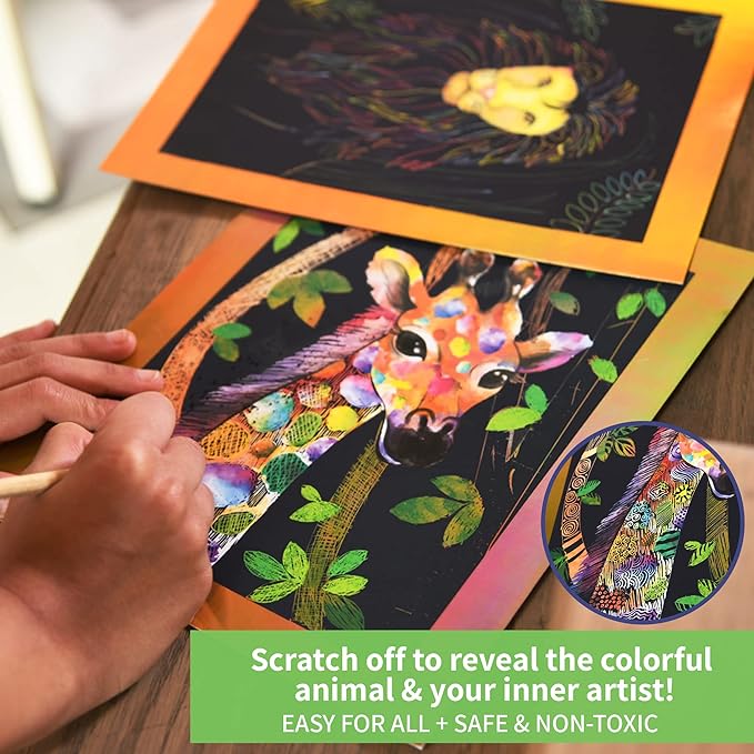 - ART MADE FUN & EASY FOR CHILDREN: Make beautiful portraits of 2 animals- the lion and the giraffe by drawing and scratching over the images. Use the wooden stylus to reveal the magical masterpiece hidden below. Doodle, add patterns or just scratch away to make your unique art